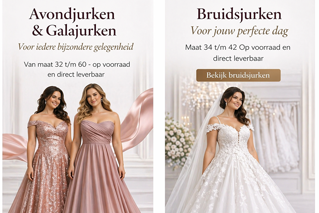 Ruim 1000 jurken onder de €1000,- op voorraad en direct leverbaar in alle maten 32 t/m 60.