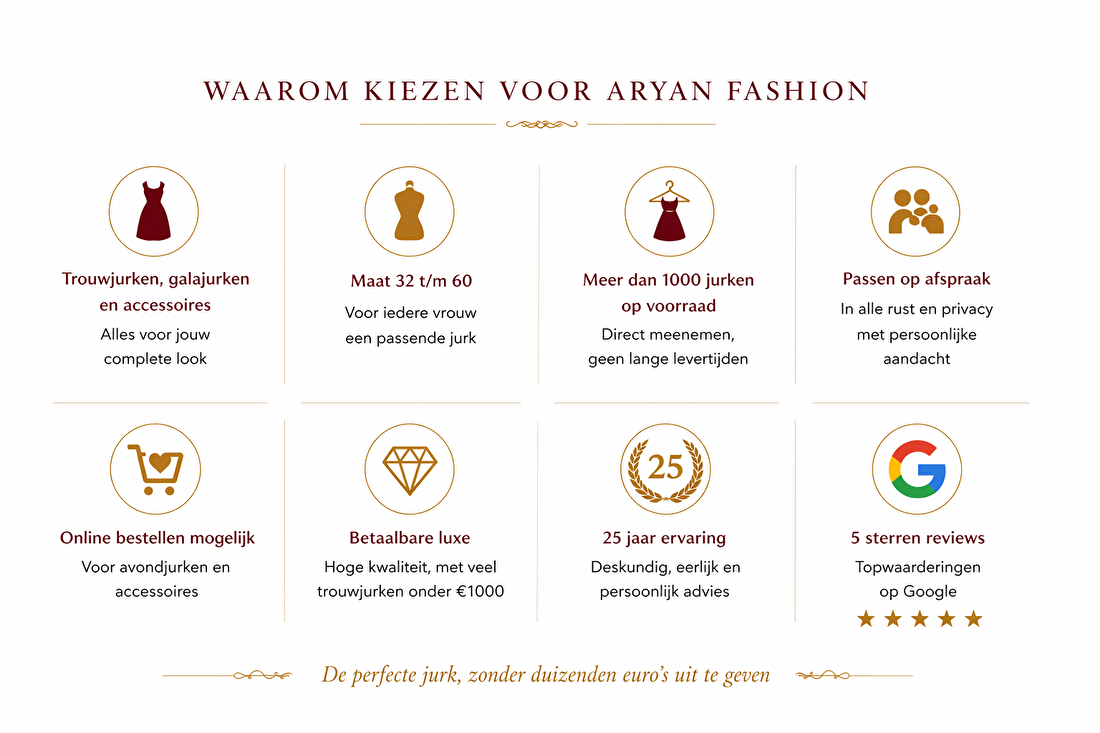Aryan Fashion is hèt adres voor betaalbare bruidsjurken en galajurken, speciaal voor de dames die niet duizenden euro’s willen of kunnen spenderen aan een bruidsjurk of honderden euro’s aan een feestjurk, maar toch soortgelijke kwaliteit prefereren, zodat ze voor weinig geld kunnen stralen op hun trouwdag of een bijzondere gelegenheid.