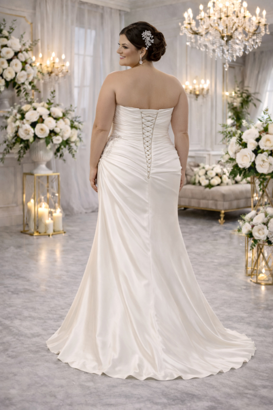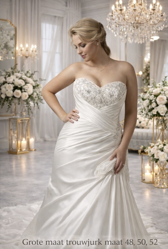 Curvy trouwjurk ivoor satijn strapless maat 48 50 52