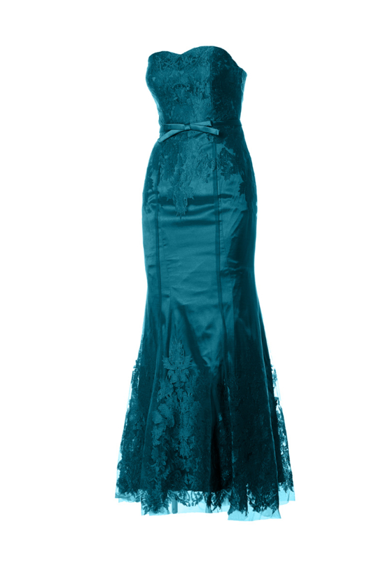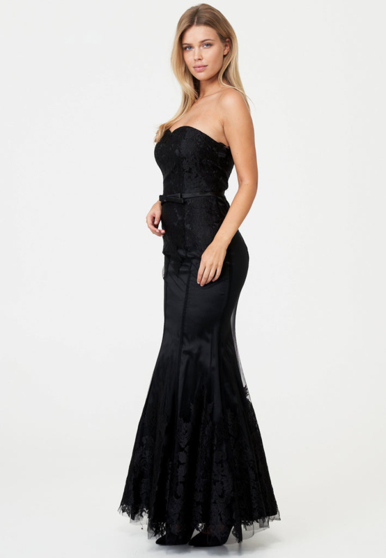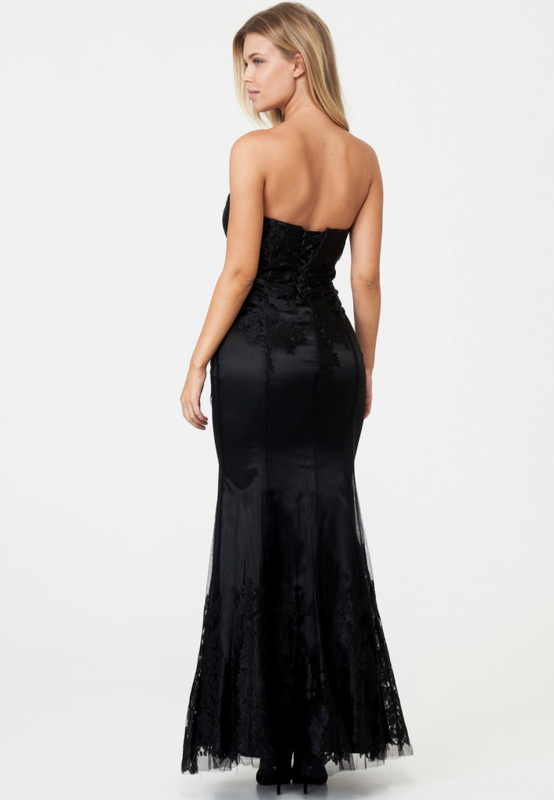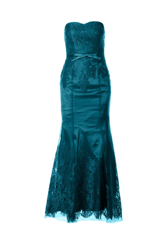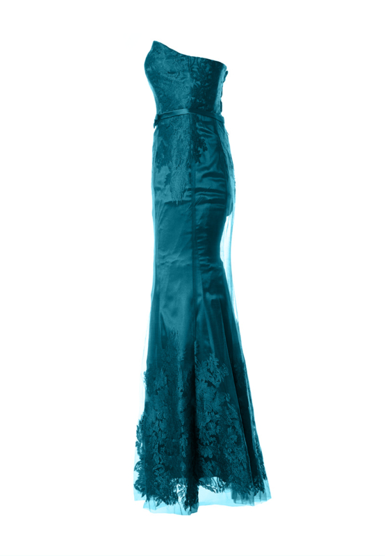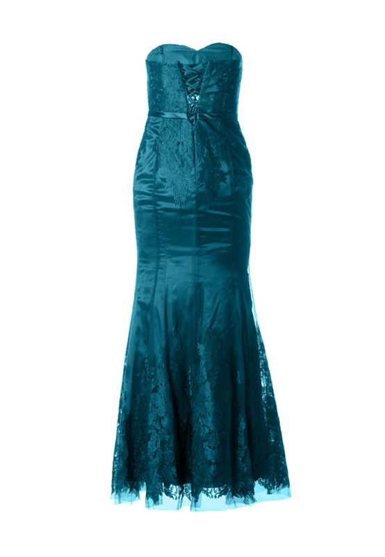 This beautiful long dress is cut in the "Mermaid" look. It is a combination of tulle and embroidery. The dress is laced in the back and underneath is a zipper. The dress is made of 100% polyester.