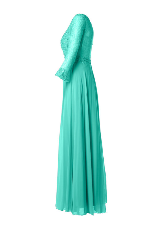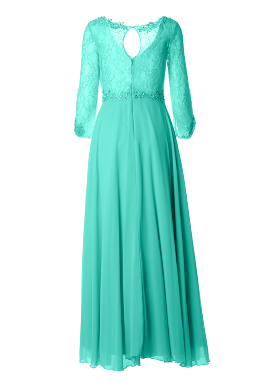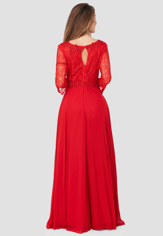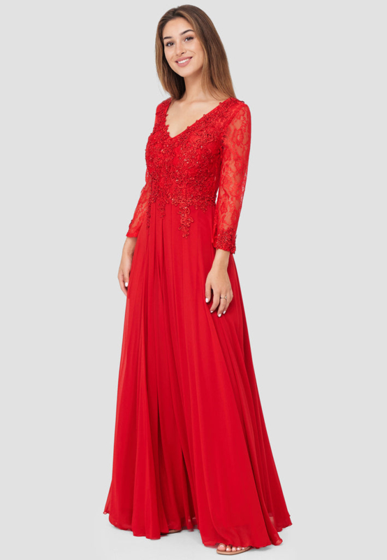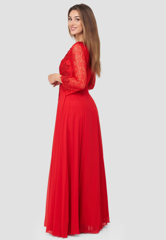 This evening dress seduces every woman. The dress has 3/4 long sleeves. The décolleté area as well as the back of the dress are almost completely transparent. The floor-length dress falls smoothly from the waist and flatters the figure in a very charming way. The dress has as well integrated cups and is closed at the back with a zipper. This dress is made out of 100% polyester.