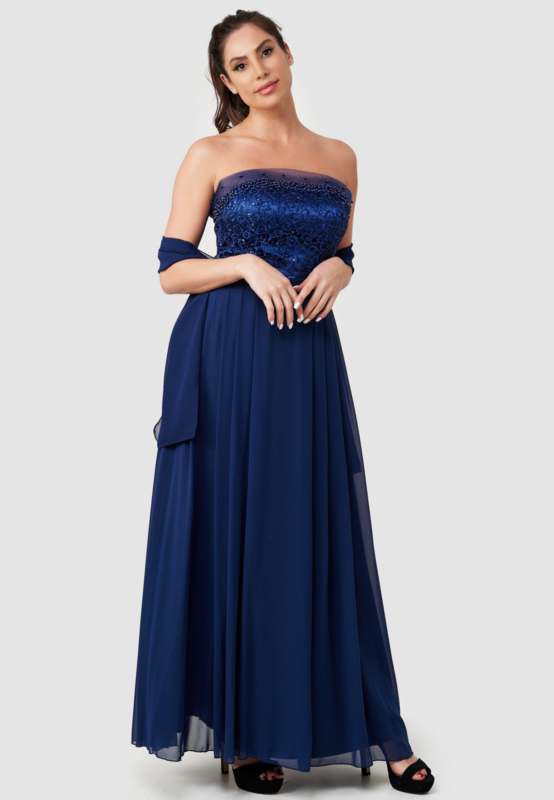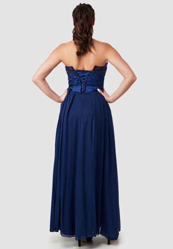 This dress has a real wow effect, because this feminine evening dress is embroidered with sequins and pearls. Also, the dress has a tulle border. It has a lacing and a zipper on the back so that a nice fit can be guaranteed. The flowing skirt is made of a soft chiffon. This dress is made of 100% polyester.