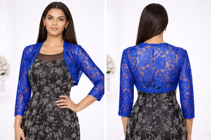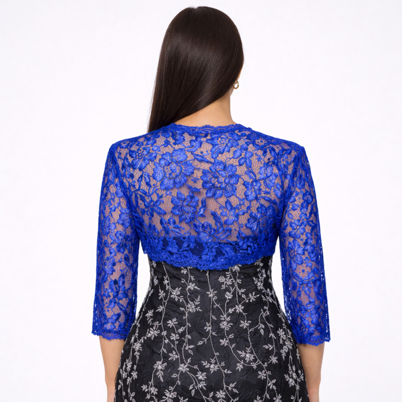 Deze elegante bolero van luxe kant in een diepe royalblauwe kleur is een stijlvolle toevoeging aan iedere feestelijke outfit.