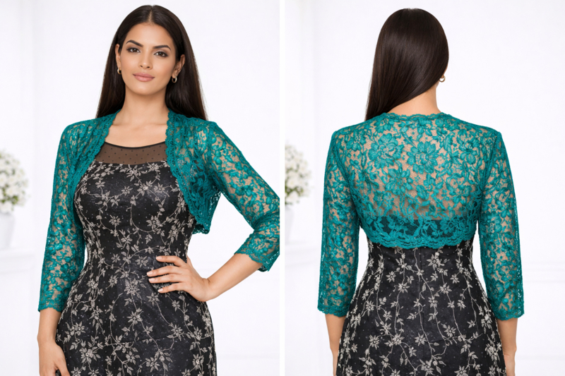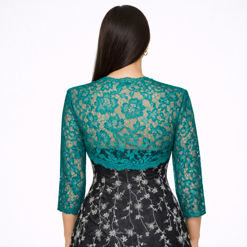 Deze elegante bolero van luxe kant in een diepe petrolkleur is een stijlvolle toevoeging aan iedere feestelijke outfit.