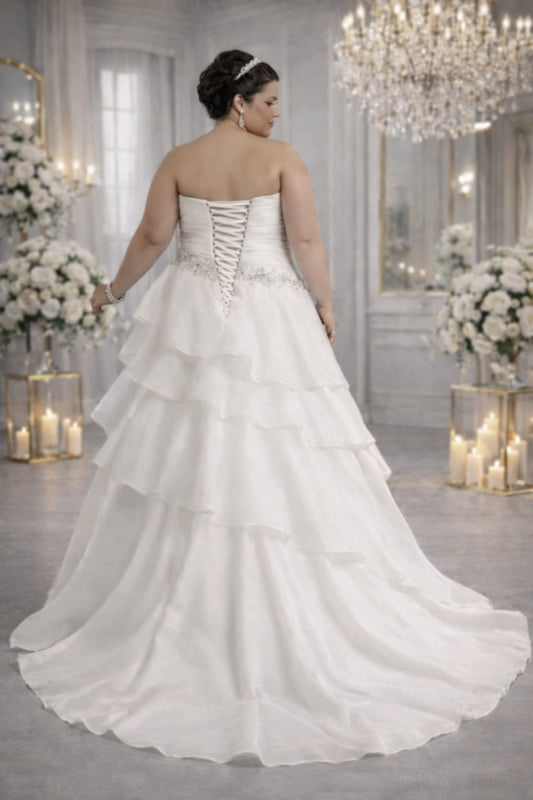 Deze romantische grote maten prinsessen trouwjurk in ivoorkleur heeft een elegant strapless lijfje met een recht decolleté en een prachtig geplooid bovenstuk dat zorgt voor een flatterende pasvorm.