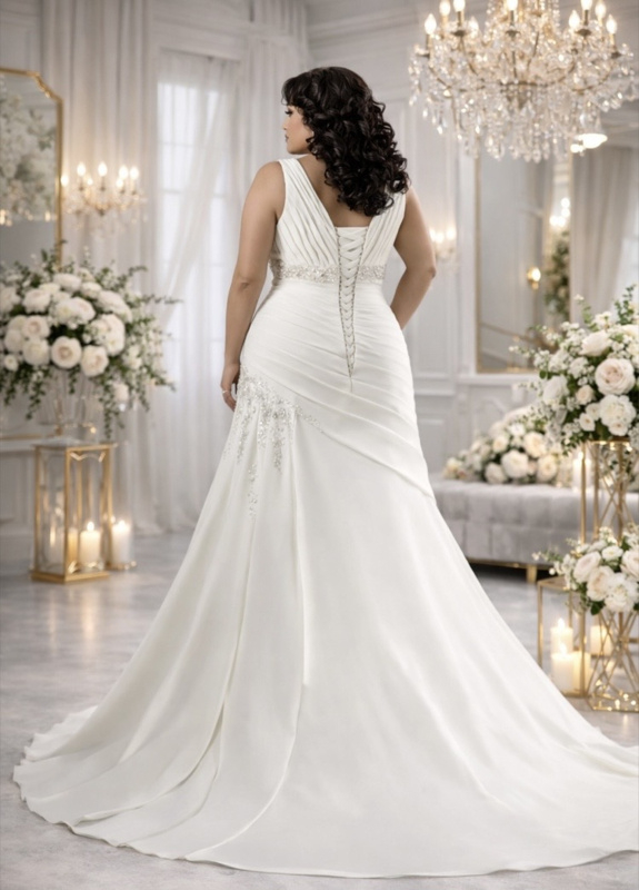 Deze elegante grote maten trouwjurk in ivoorkleur heeft een flatterend wikkelmodel dat het lichaam mooi volgt en zorgt voor een slank silhouet.