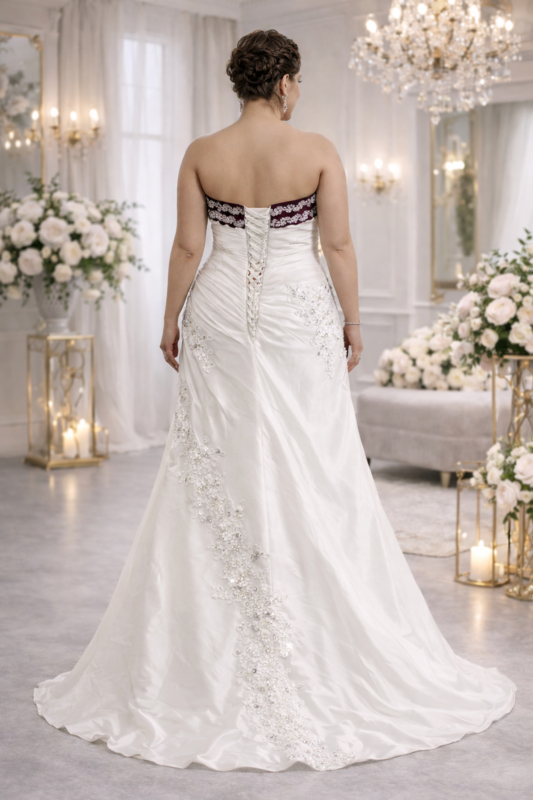 Deze bijzondere grote maten trouwjurk combineert een klassieke witte basis met een stijlvolle bordeaux kleurige top, wat zorgt voor een unieke en opvallende uitstraling.