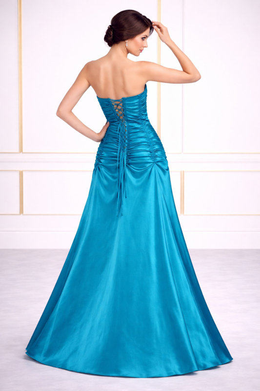Petrol kleur galajurk– strapless met vetersluiting en tule voering