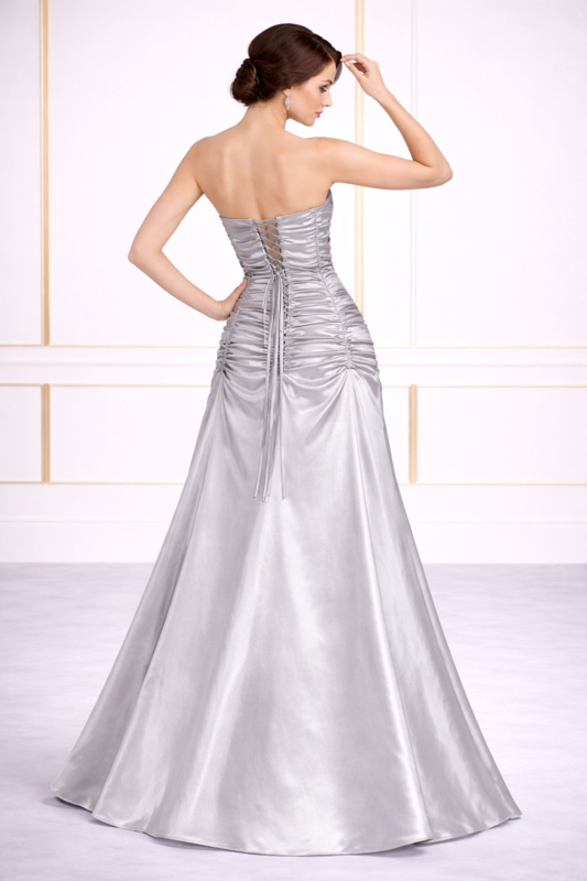 Zilver kleur galajurk – strapless met vetersluiting en tule voering.