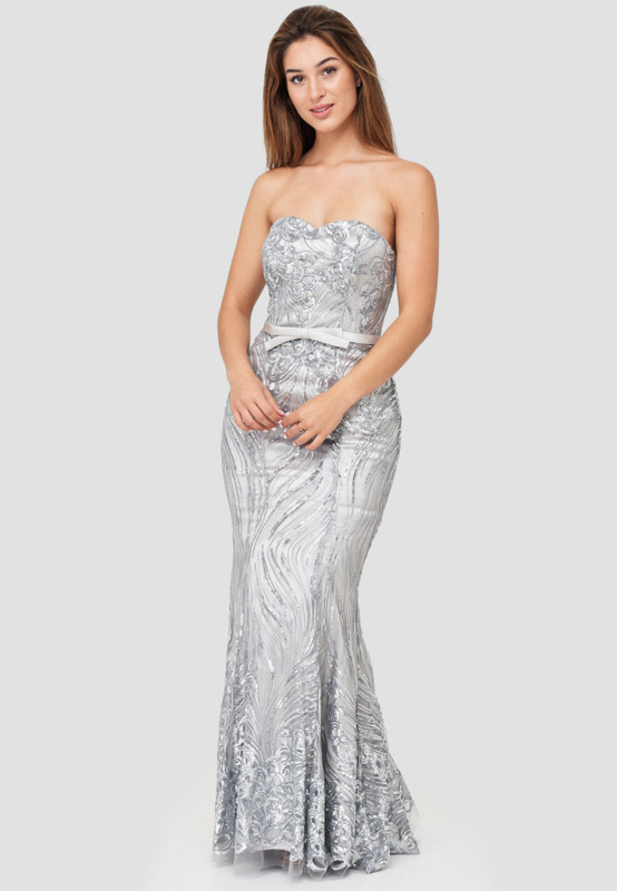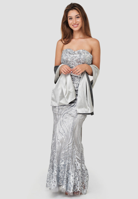 Maak een onvergetelijke indruk met deze lange zilveren galajurk – een echte eyecatcher voor elke bijzondere gelegenheid.