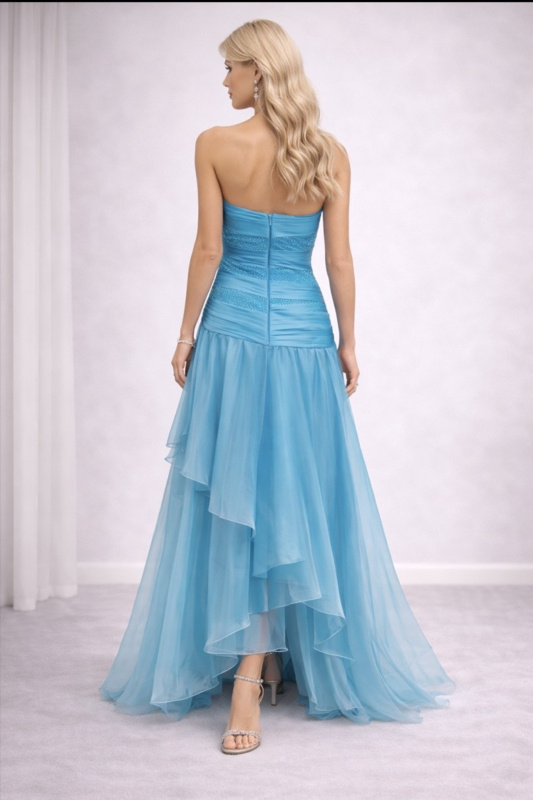 Galajurk – strapless, high-low model met kralen en strokenrok.