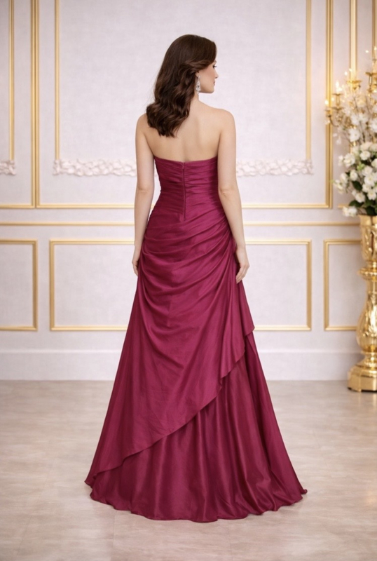 Strapless galajurk met verfijnd geplooid lijfje dat de taille benadrukt.
