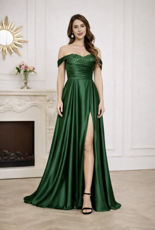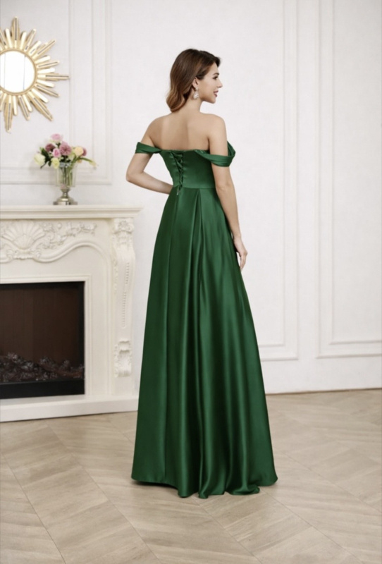 Groene Off Shoulder Galajurk Satijn met Split – Maat 40 42