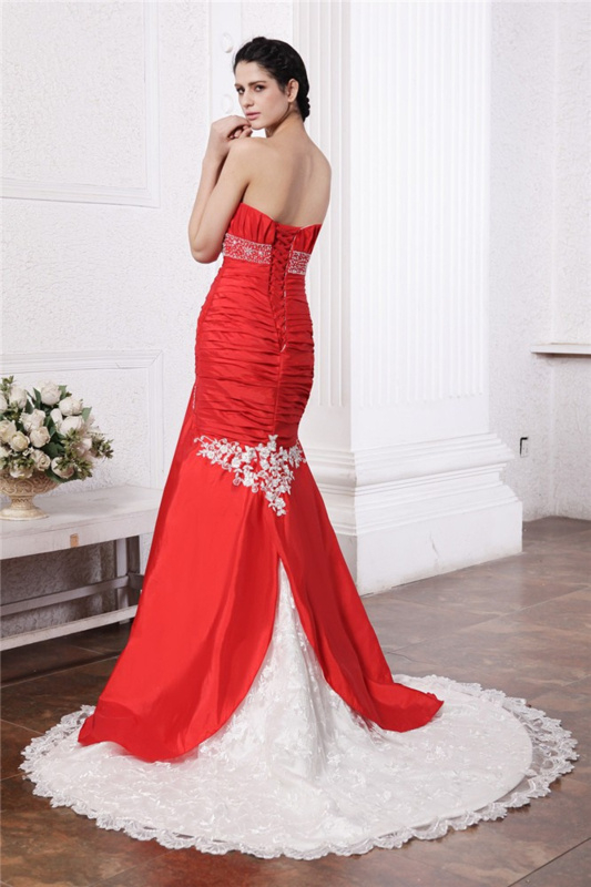 Strapless galajurk zeemeermin model met sleep van glanzend satijn, luxe kant en bloemenapplicaties.