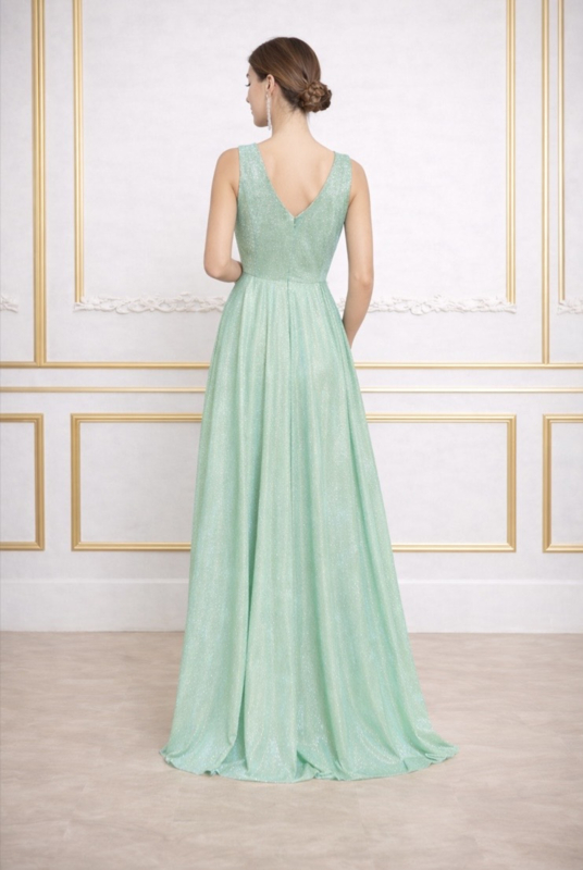 Deze mouwloze avondjurk met diep V-decolleté straalt luxe en elegantie uit.