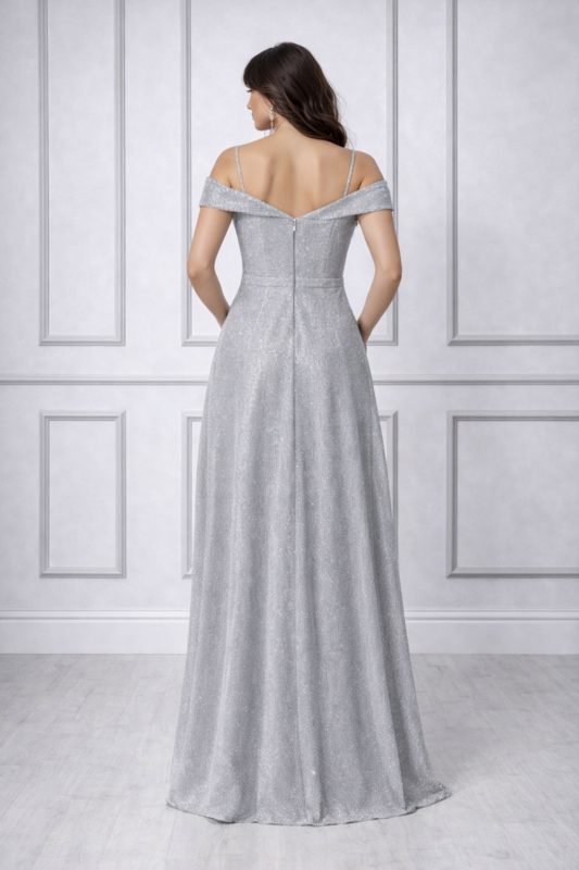 Zilveren Galajurk met Glitter en Split – Off Shoulder Avondjurk Maat 40 42.
