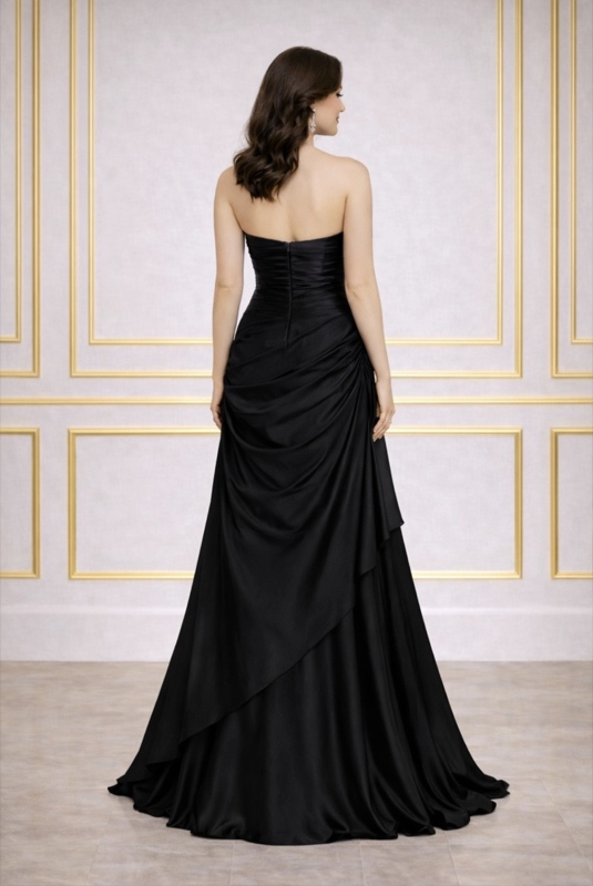Strapless galajurk met verfijnd geplooid lijfje dat de taille benadrukt.