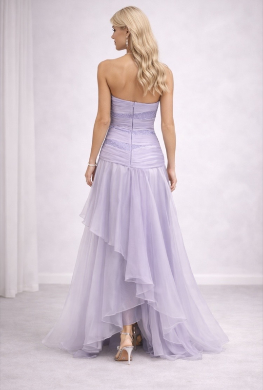 Lila galajurk – strapless high-low galajurk met kralen en strokenrok.