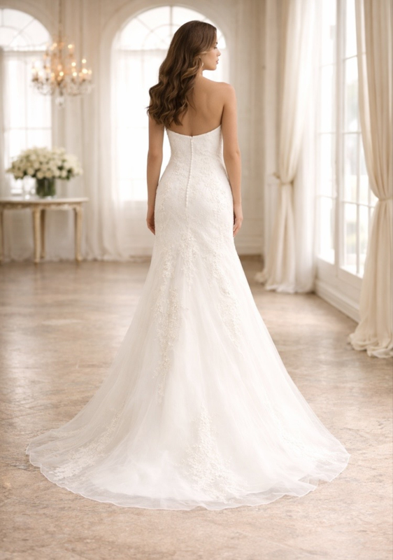 Deze A-lijn trouwjurk met strapless lijfje is op voorraad en direct leverbaar bij Aryan Fashion.