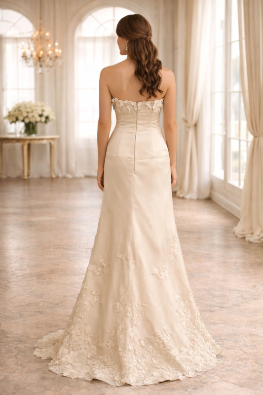 Deze aansluitende trouwjurk met strapless lijfje is op voorraad en direct leverbaar bij Aryan Fashion.