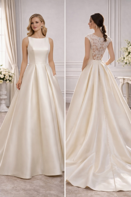 De jurk is gemaakt van hoogwaardig bruidssatijn, wat zorgt voor een luxe look, mooie structuur en een comfortabele pasvorm. Dankzij de subtiele plooien en praktische steekzakken krijgt deze jurk een moderne en verfijnde uitstraling.