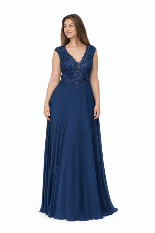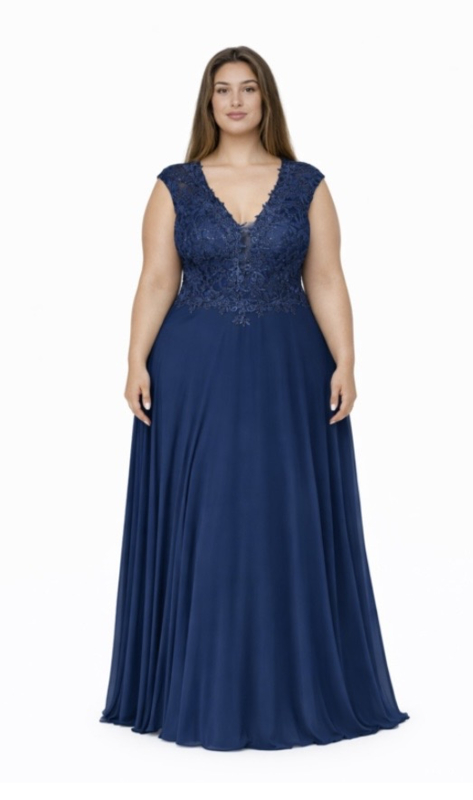 Elegante plus size galajurk met diepe V-halslijn en brede schouderbanden, luxe kant en subtiele details.