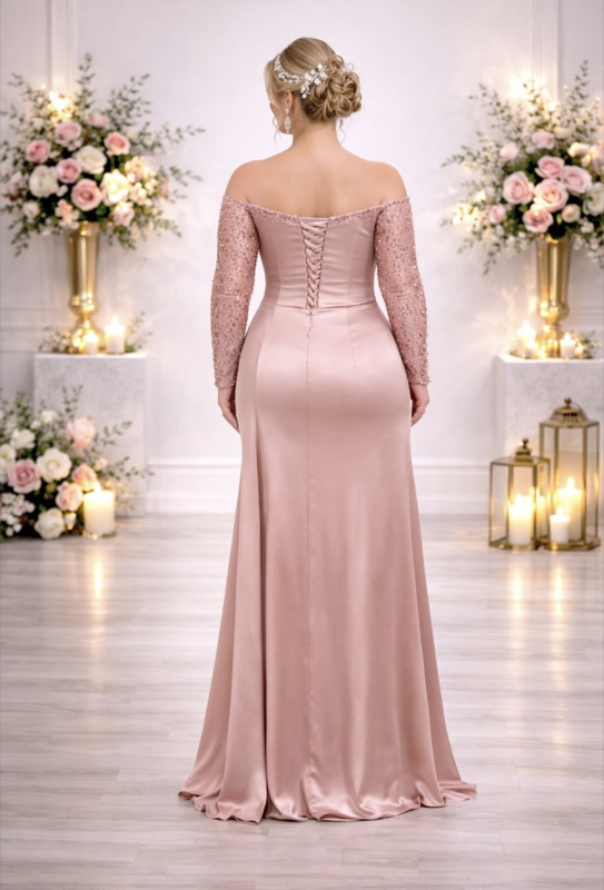 Deze elegante galajurk met Carmen halslijn is een prachtige keuze voor dames met een grotere maat, die op zoek zijn naar een feestelijke en vrouwelijke look.