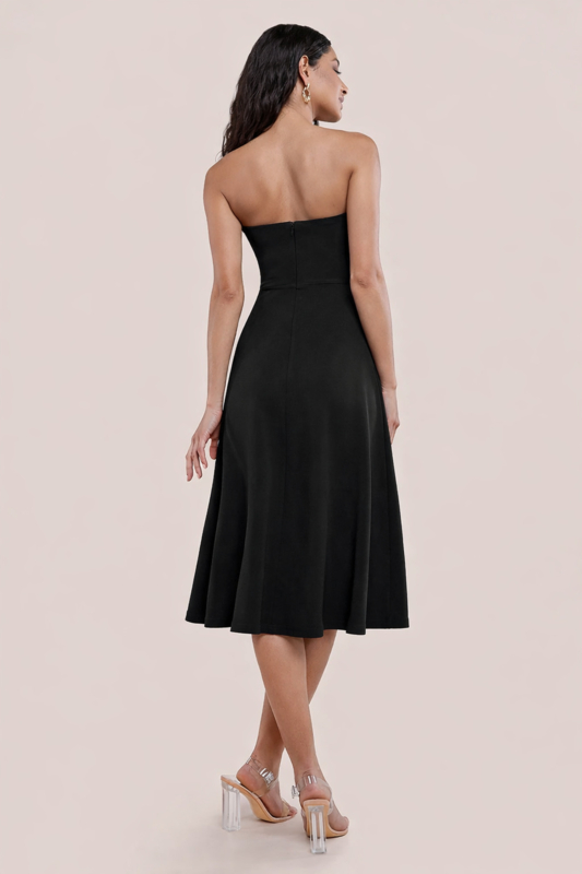 Deze cocktailjurk heeft een halterband en een mooi aansluitend bovenlijfje dat overloopt in een A-lijn rok.
