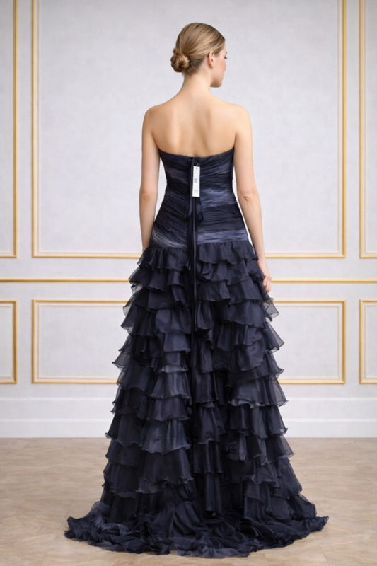 Met haar opvallende silhouet en elegante afwerking is deze zwarte strapless galajurk met korte sleep een echte eyecatcher voor elke gelegenheid.