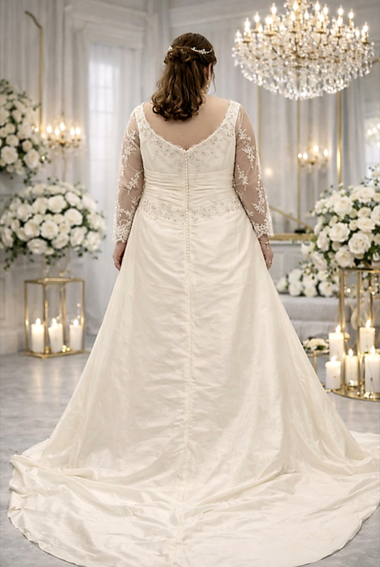 Bruidsjurk grote maat beige kant mouwen maat 50 52 54