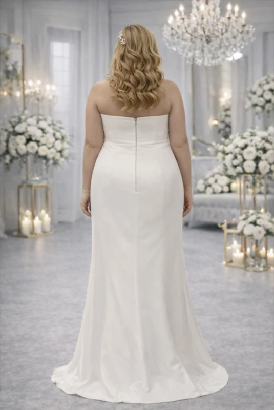 Deze moderne grote maten trouwjurk in ivoorkleur is uitgevoerd in glad bruidssatijn en heeft een strak model met een elegante uitstraling.