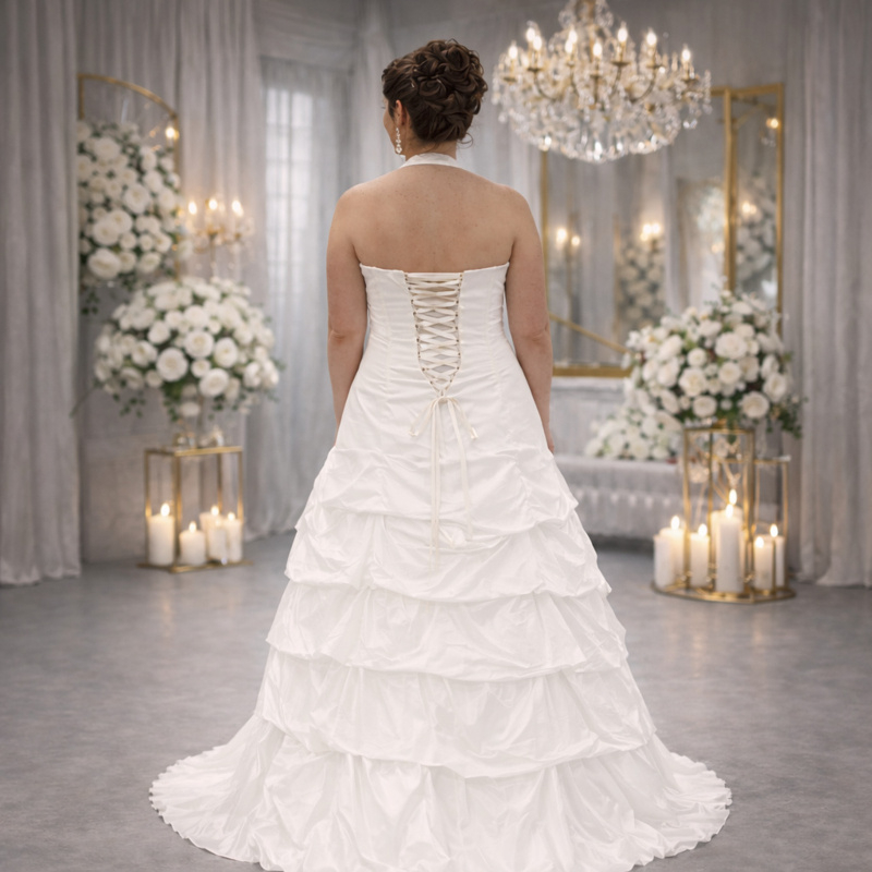 De vetersluiting aan de achterkant zorgt voor een perfecte pasvorm en extra ondersteuning, waardoor deze jurk zeer geschikt is als grote maten bruidsjurk.