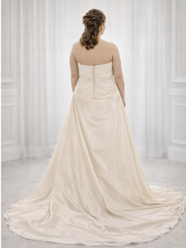 Deze stijlvolle grote maten trouwjurk in beige heeft een elegante en tijdloze uitstraling.
