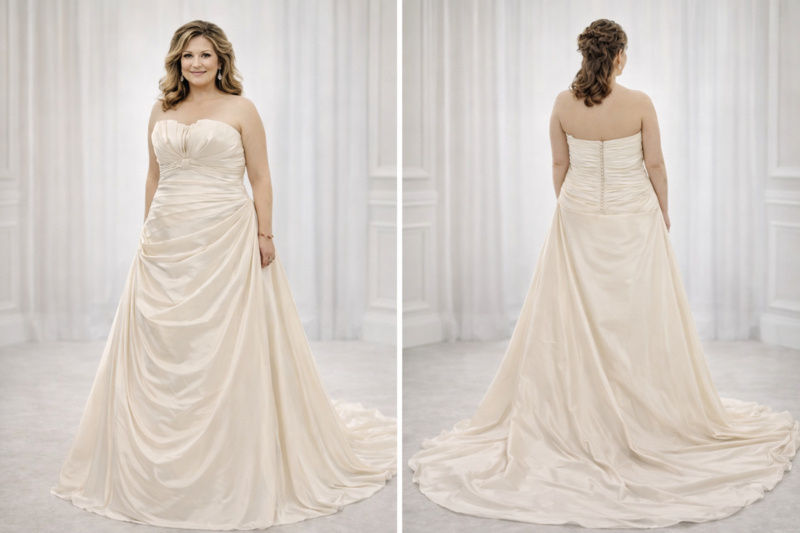 De subtiele plooien lopen door over de rok, waardoor de jurk het lichaam op een flatterende manier volgt en eventuele zones mooi camoufleert — ideaal voor grote maten.