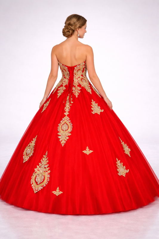 De jurk is uitgevoerd in een diepe, luxe rode kleur en rijkelijk versierd met elegante gouden borduursels en applicaties. Het strapless lijfje sluit prachtig aan en zorgt voor een vrouwelijke, elegante uitstraling. Dankzij de vetersluiting aan de achterkant kan de jurk perfect op maat worden aangesnoerd, waardoor een mooie pasvorm ontstaat.