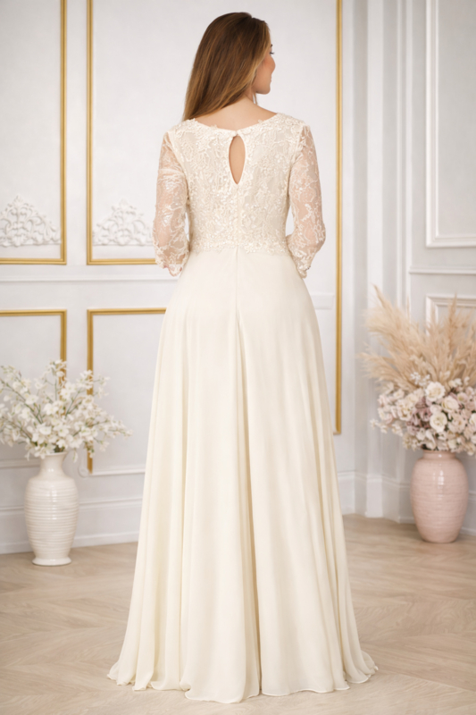 Grote maten trouwjurk ivoor maat 48 t/m 60 – chiffon A-lijn met lange mouwen en luxe kant.