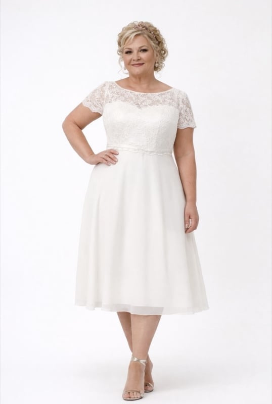 De knielengte maakt deze jurk ideaal voor een informele bruiloft, een tweede huwelijk of een zomerse ceremonie.