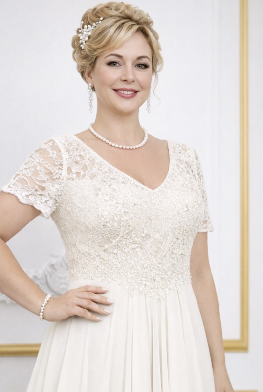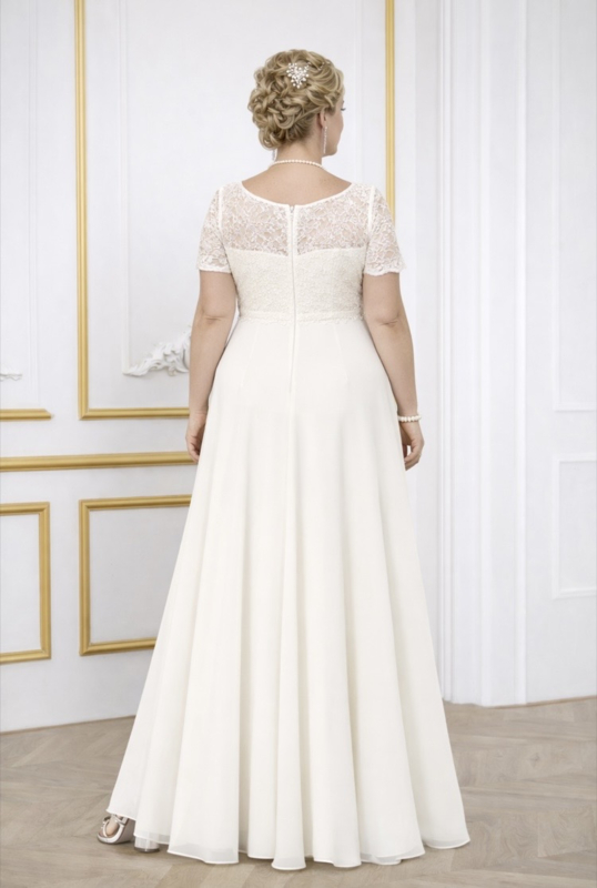 Grote maten trouwjurk ivoor maat 44 t/m 50 – chiffon A-lijn met luxe kant en mouwen.