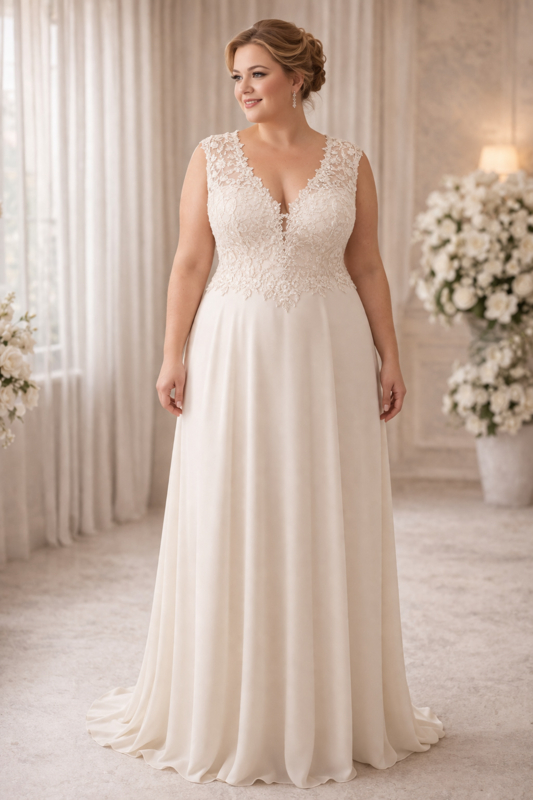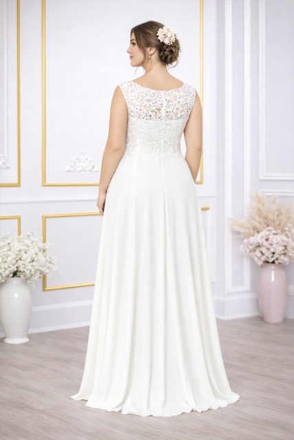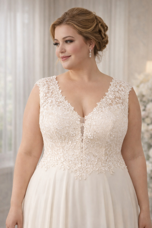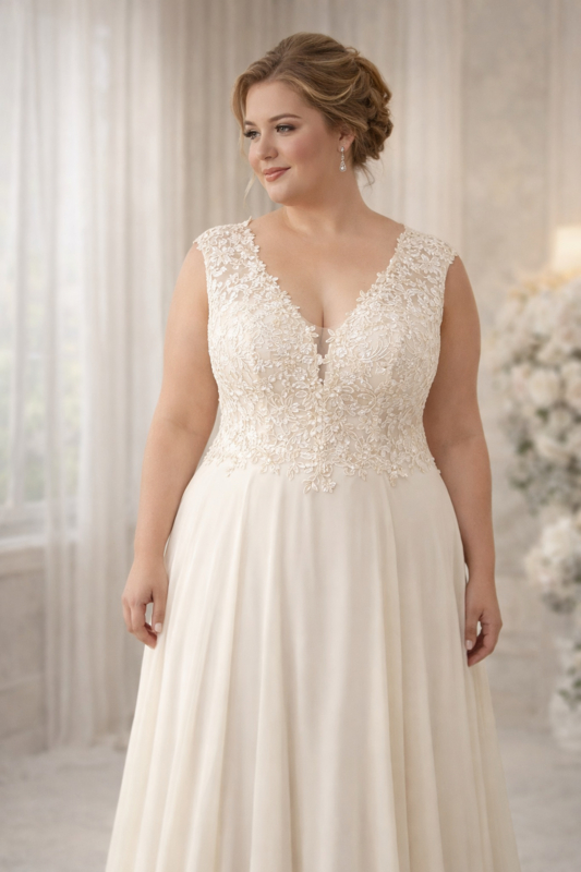Deze elegante grote maten trouwjurk in ivoor is speciaal ontworpen voor een flatterende en comfortabele pasvorm.