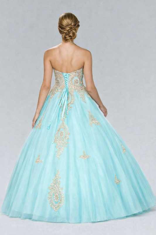 De frisse turquoise kleur gecombineerd met luxe goudkleurige borduursels zorgt voor een exclusieve en elegante uitstraling. Het strapless lijfje is rijk bewerkt en sluit mooi aan, terwijl de volumineuze tule rok een prachtig prinsesseneffect creëert.