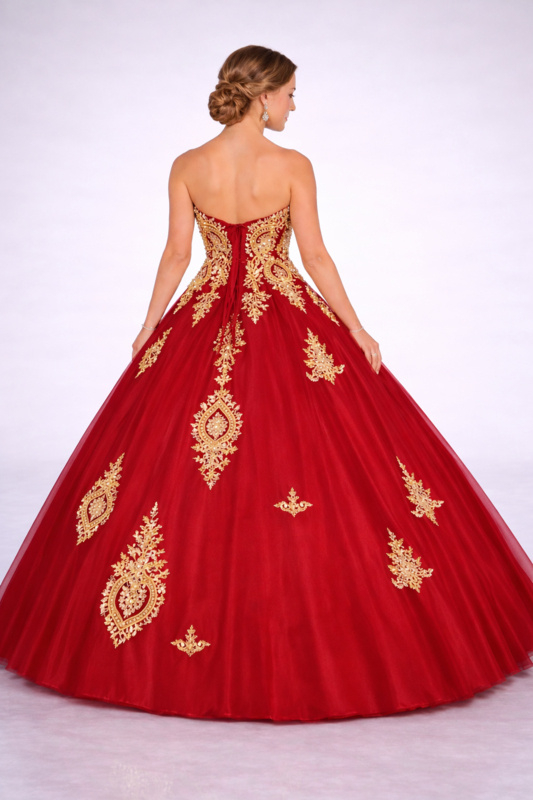 De diepe bordeaux kleur gecombineerd met rijke gouden borduursels geeft deze jurk een warme, chique en koninklijke uitstraling. Het strapless lijfje is volledig bewerkt met luxe applicaties en zorgt voor een prachtige, vrouwelijke pasvorm.