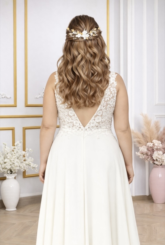 De V-hals aan de voorzijde en de elegante lage rug aan de achterkant geven de jurk een verfijnde en vrouwelijke look. De lichte chiffon stof zorgt voor comfort en bewegingsvrijheid, waardoor je je de hele dag zelfverzekerd en stralend voelt.