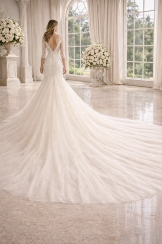 Trouwjurk met lange sleep 5 meter maat 34 36 38