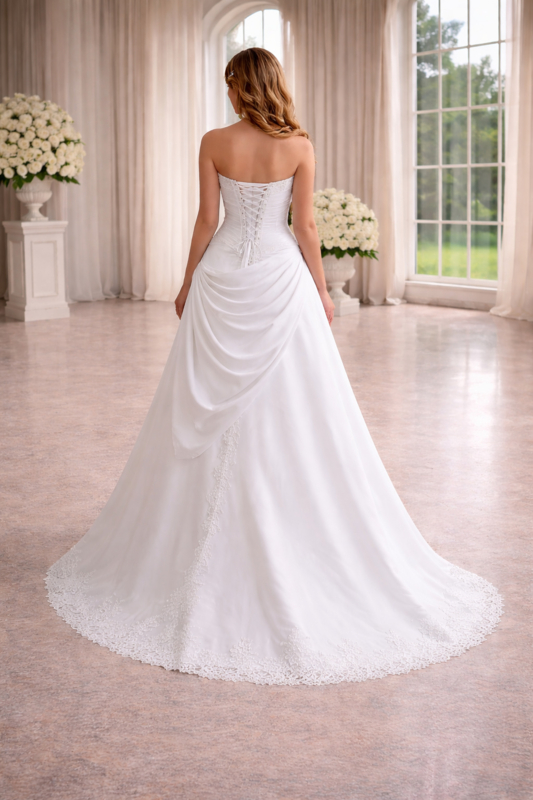 De jurk heeft een sleep wat zorgt voor een extra romantische uitstraling tijdens het lopen.