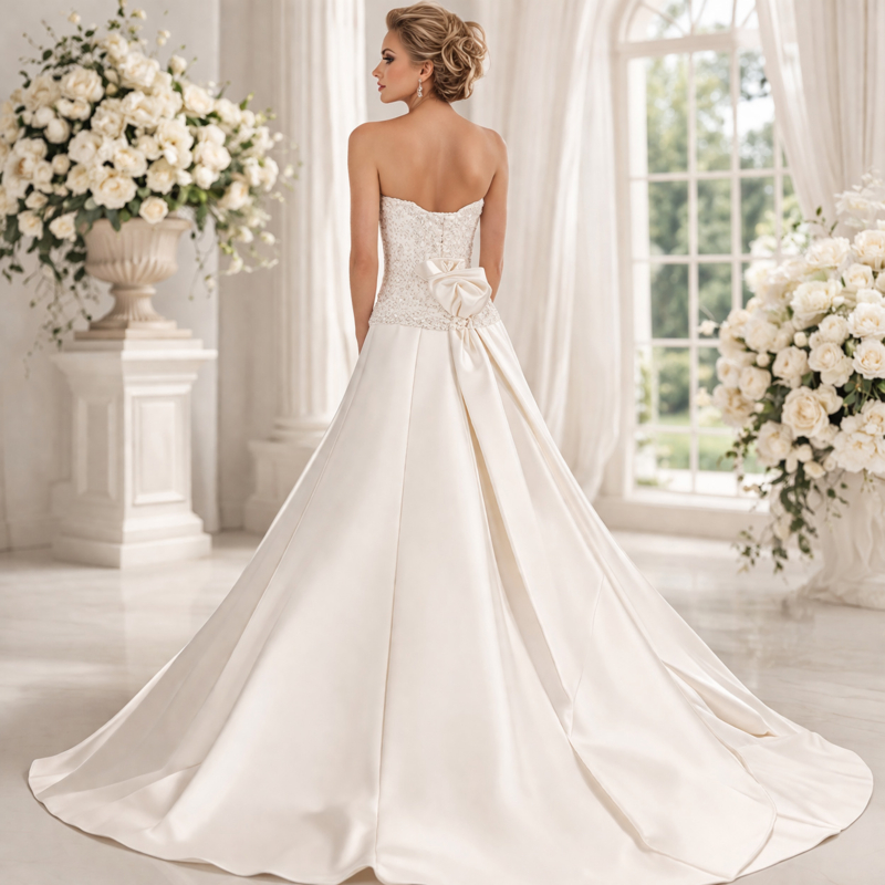 Elegante A-lijn trouwjurk met strapless design en lange sleep.