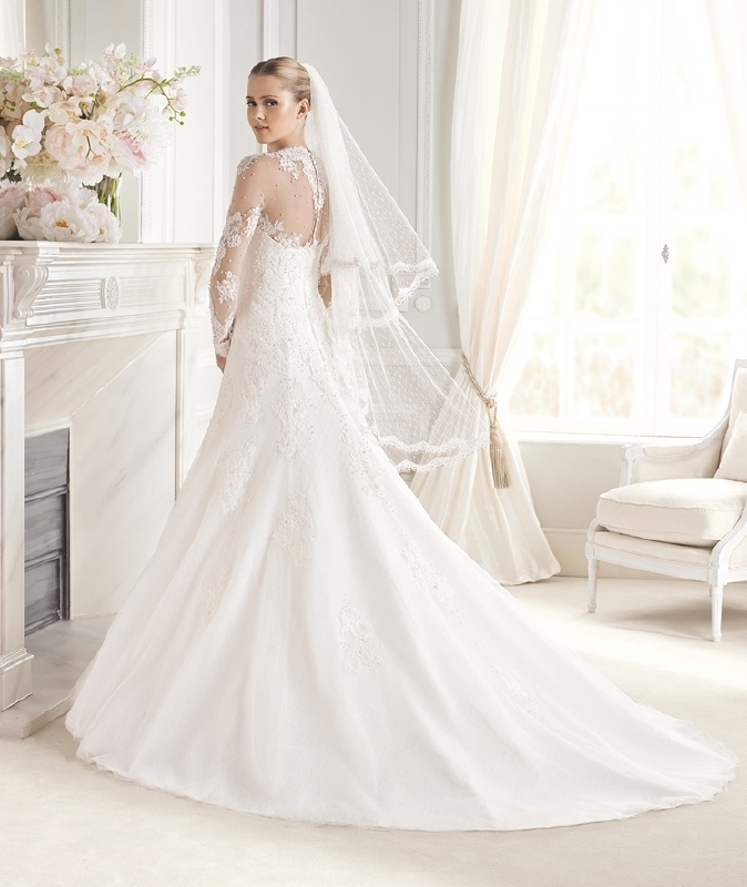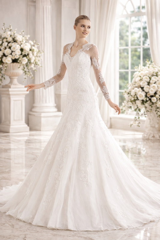 De lange kanten mouwen zijn subtiel doorschijnend en geven de jurk een tijdloze, romantische look.
