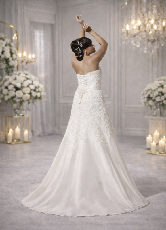 Deze romantische grote maten trouwjurk in ivoorkleur heeft een elegant A-lijn model dat het lichaam mooi volgt en zorgt voor een flatterend silhouet.