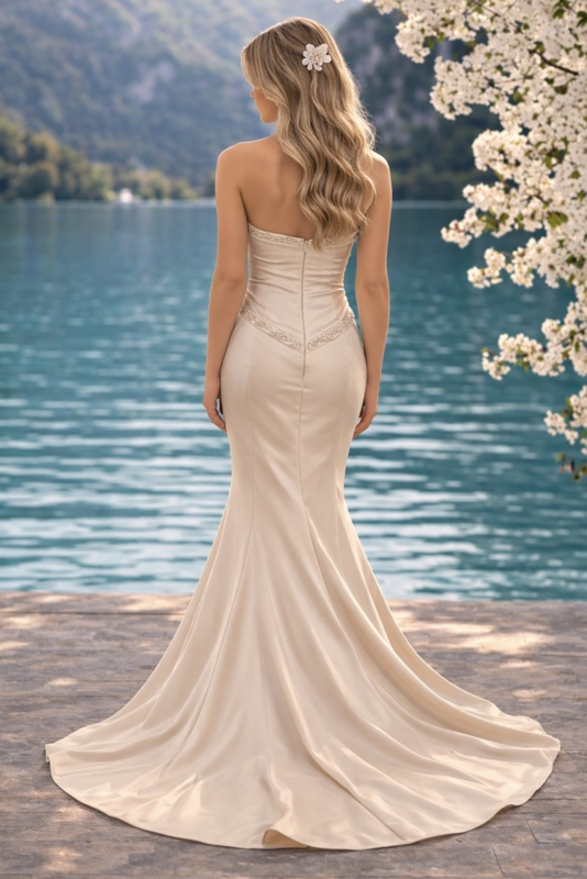 De zeemeermin pasvorm volgt mooi het silhouet en loopt uit in een zachte sleep die sierlijk over de grond valt.