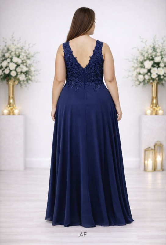 Marineblauwe galajurk in grote maten – luxe kant, v-hals en flatterende pasvorm.