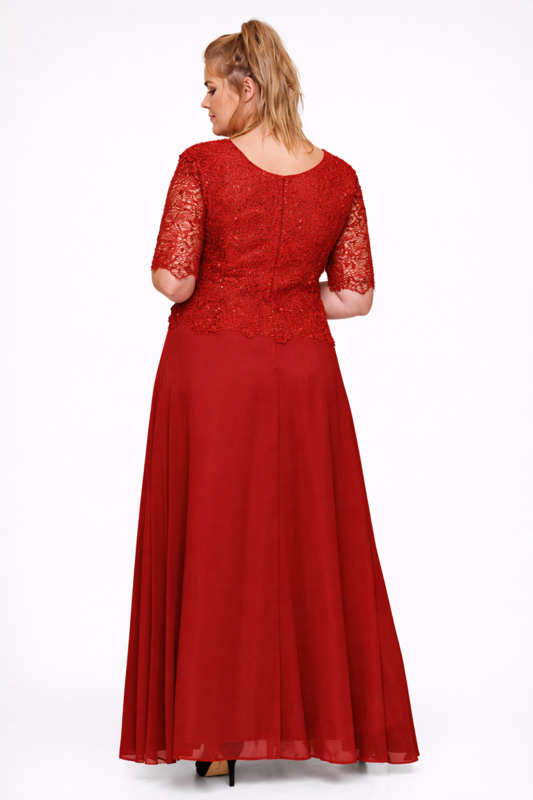Avondjurk grote maat met korte mouwen en elegant V-decolleté, luxe kant en wijde rok.